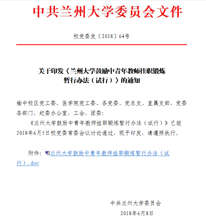 关于印发《兰州大学鼓励中青年教师挂职锻炼暂行办法(试行)》的通知